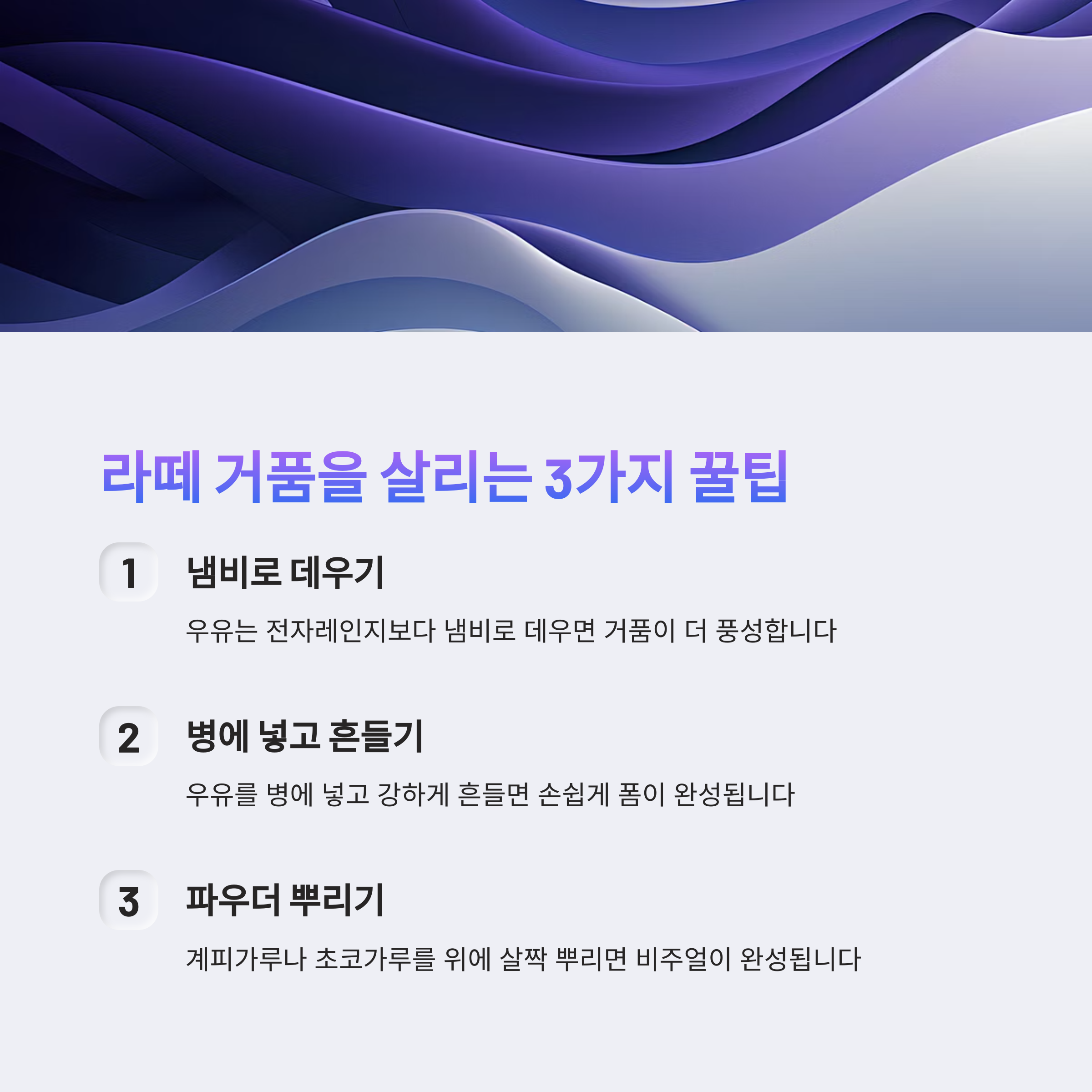 "거품만 잘 살려도, 홈카페의 느낌이 3배는 더 살아납니다."