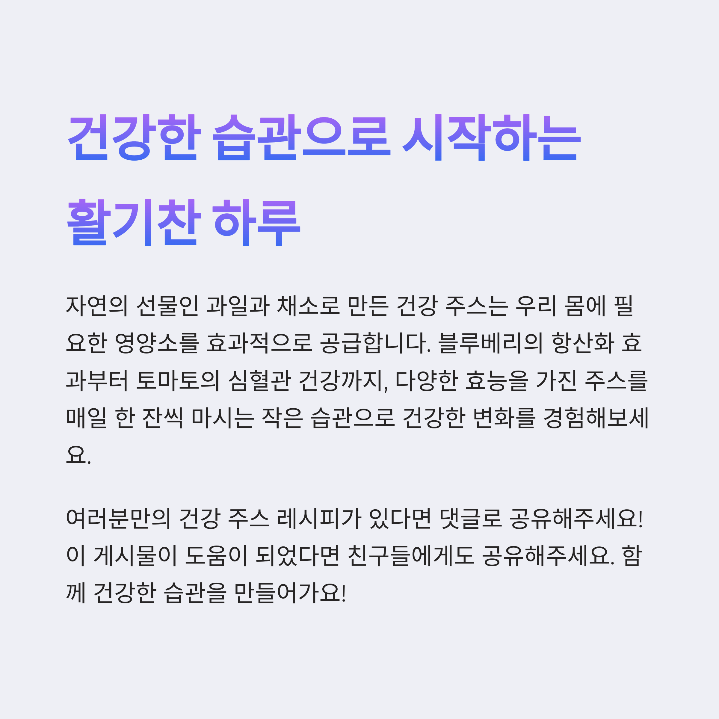 건강을 위해 식습관을 바꾸고 싶다면 간편하면서도 효과적인 방법 중 하나가 자연 재료로 만든 건강 주스 섭취입니다.