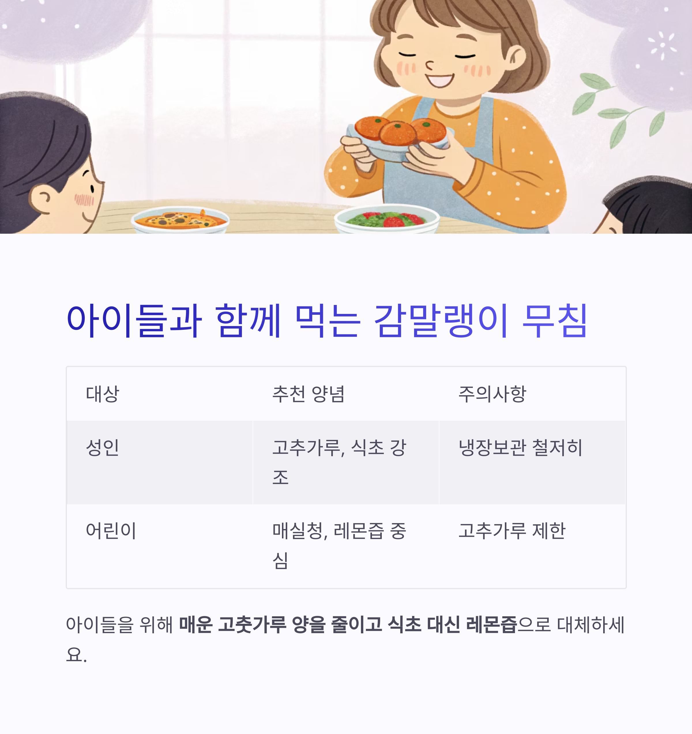 | 성인 | 고추가루, 식초 강조 | 냉장보관 철저히 |