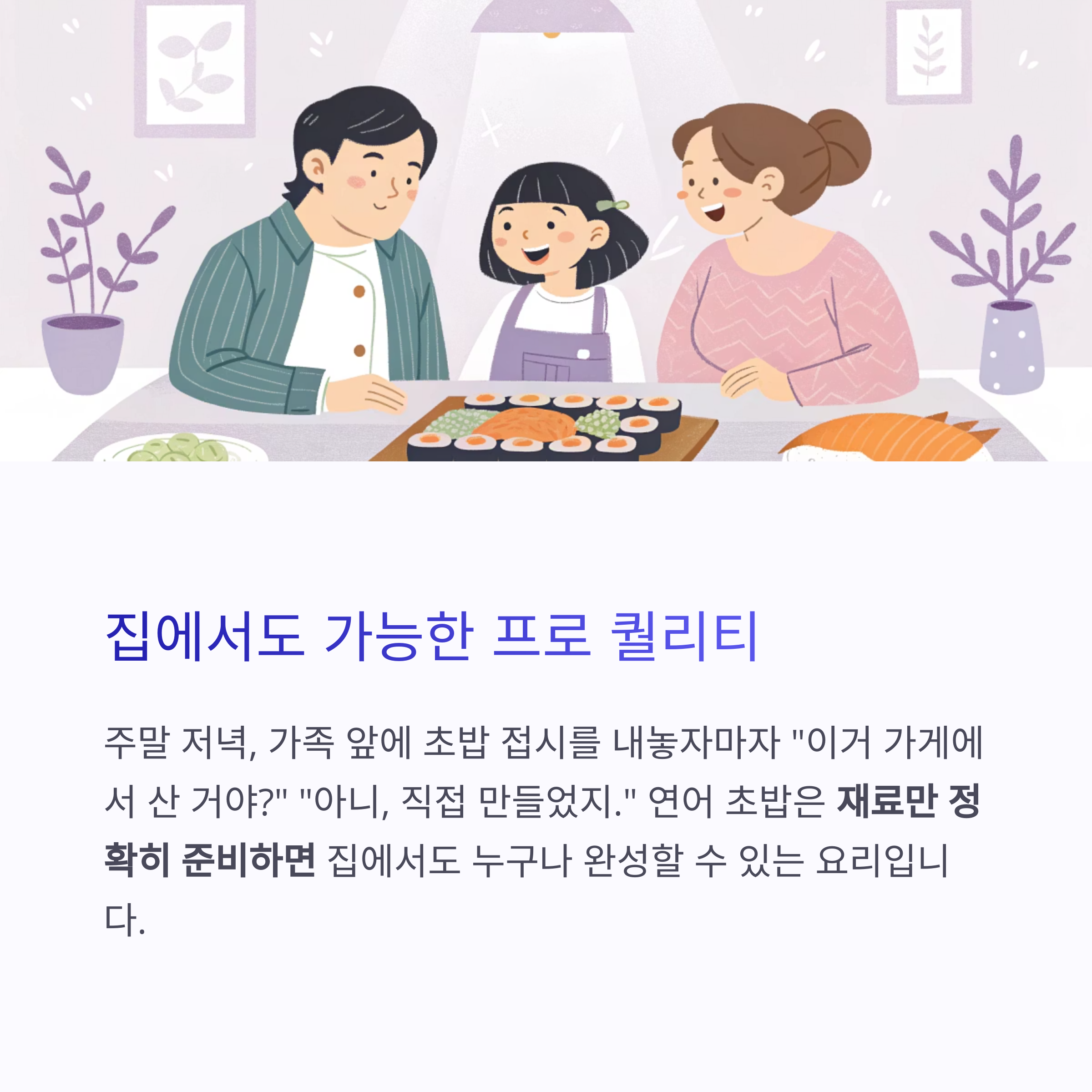 연어 초밥은 재료만 정확히 준비하면 집에서도 누구나 완성할 수 있는 요리입니다.