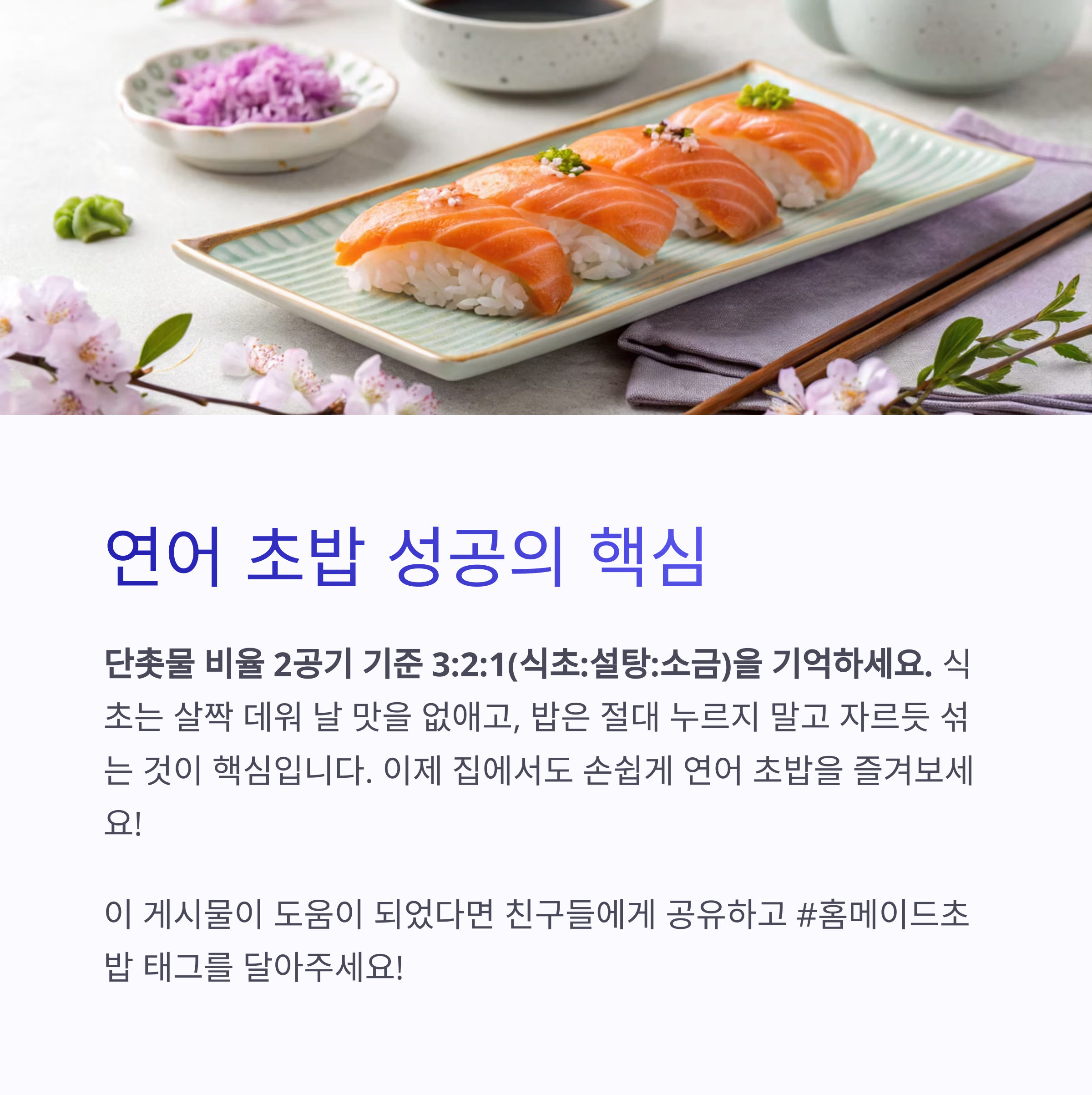 연어 초밥 성공의 핵심은 단촛물 비율과 연어 손질입니다.