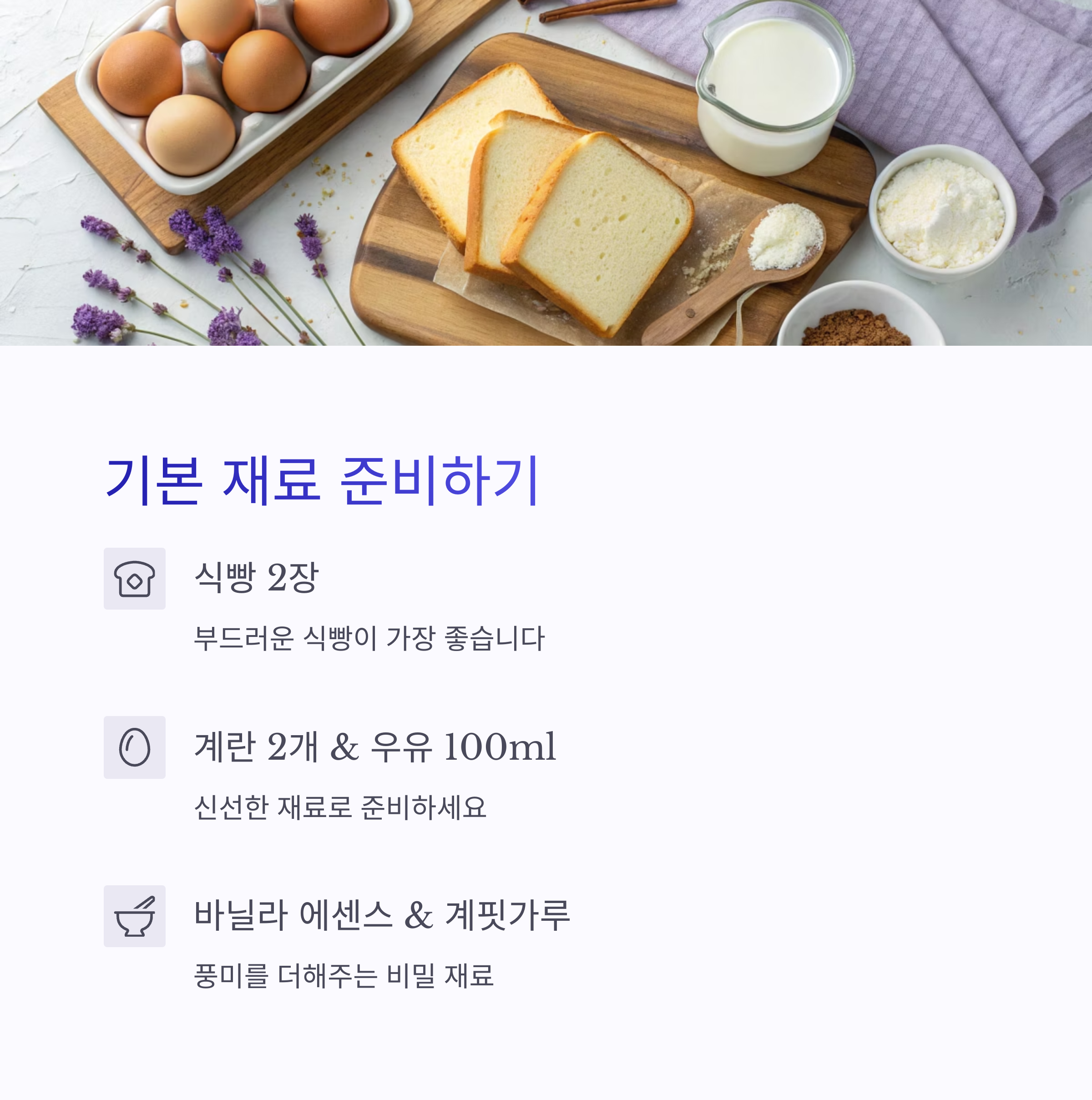 부드러운 식빵 두 장, 신선한 계란, 우유는 프렌치토스트의 핵심입니다.