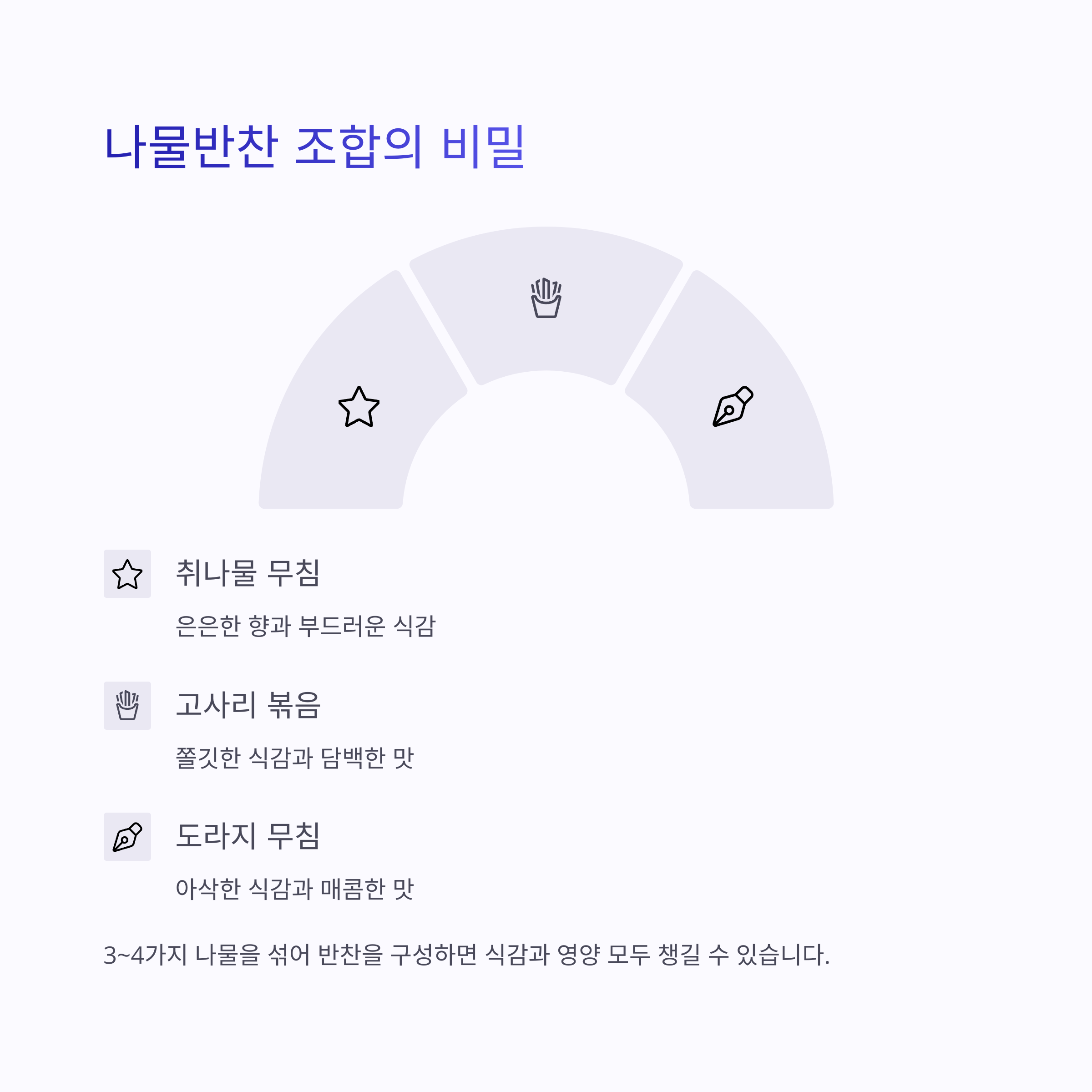 단일 나물보다 3~4가지 나물을 섞어 반찬을 구성하면 식감과 영양 모두 챙길 수 있습니다.
