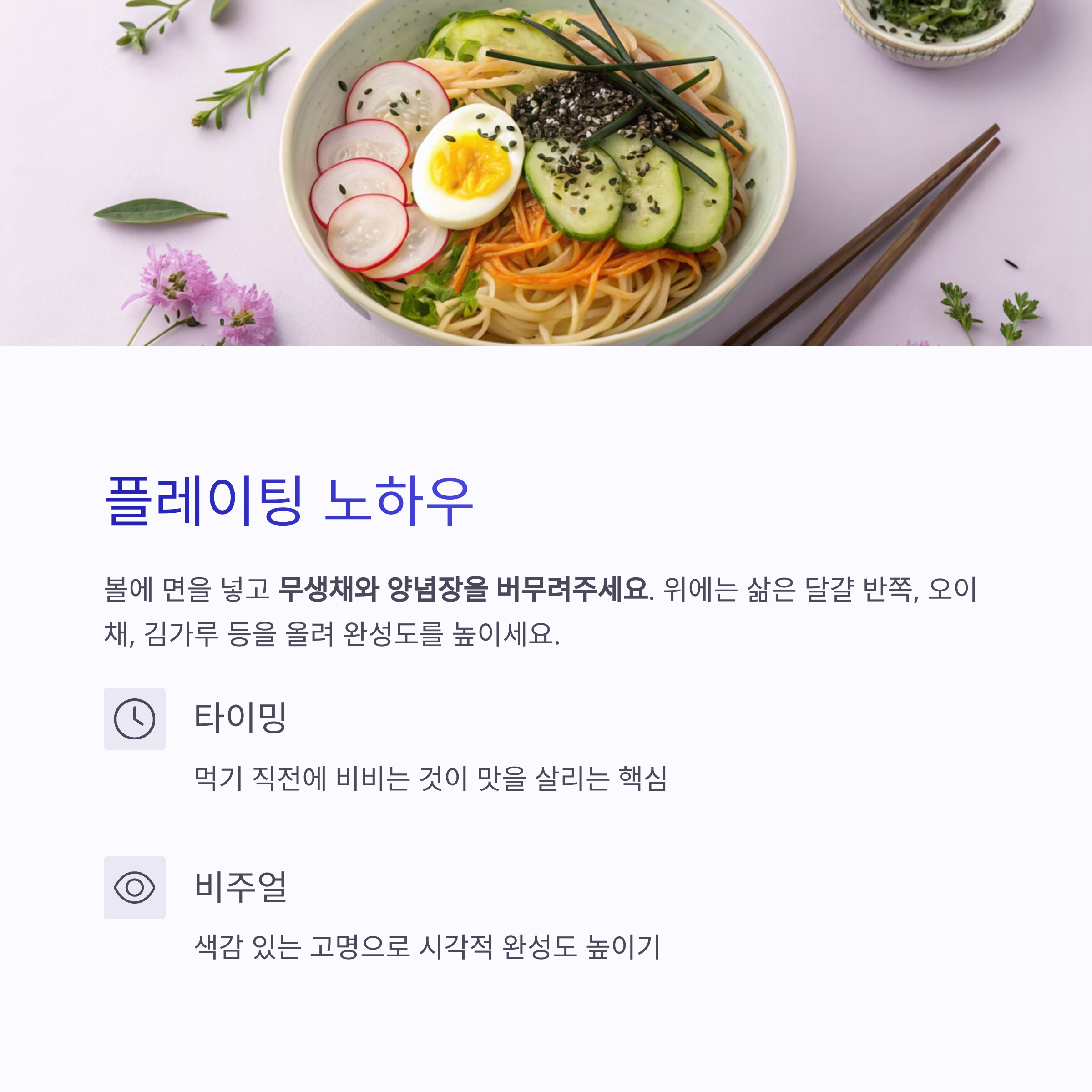 모든 재료를 한 번에 섞기보단, 먹기 직전에 비비는 것이 맛을 살리는 핵심입니다.