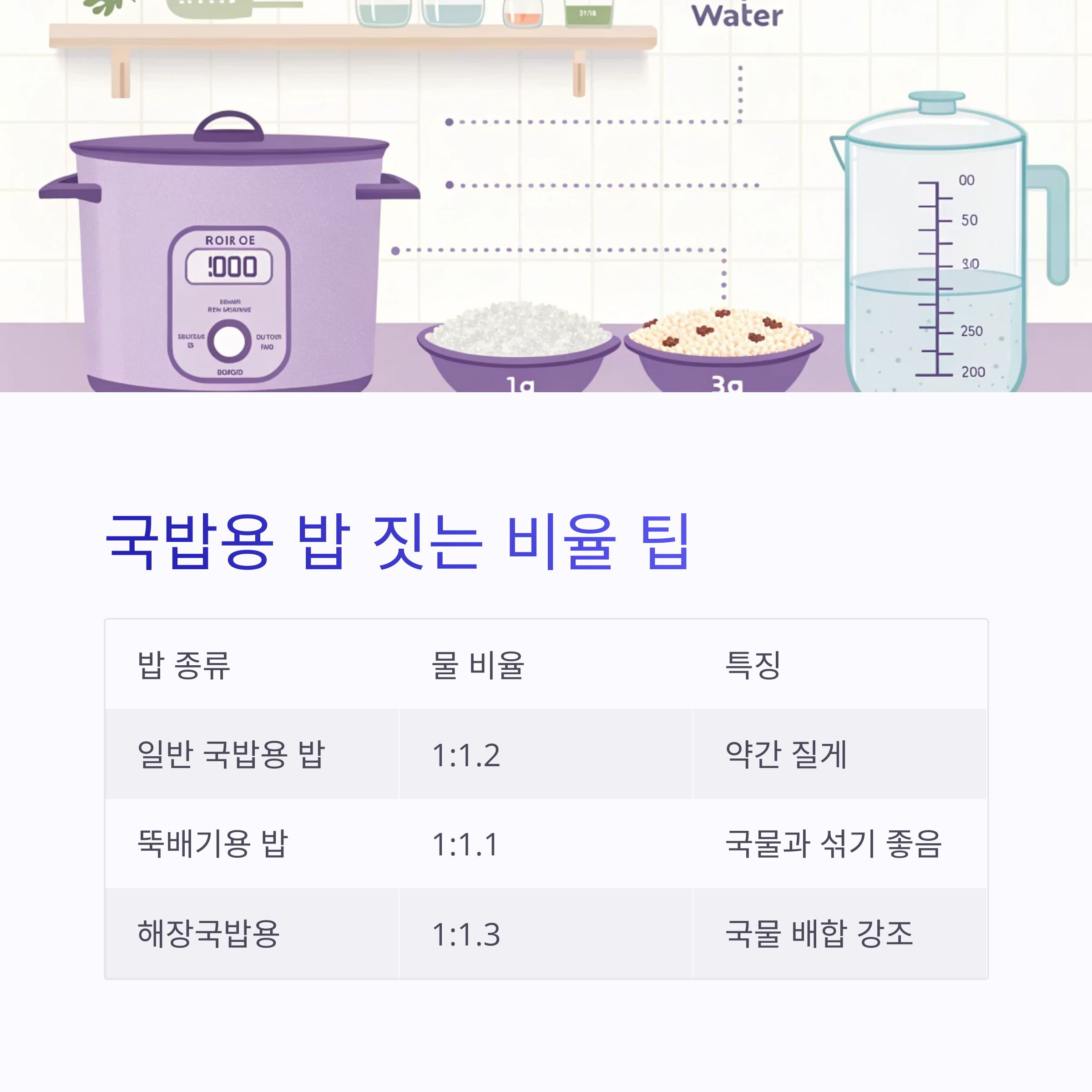 | 뚝배기용 밥 | 1:1.1 | 국물과 섞기 좋음 |